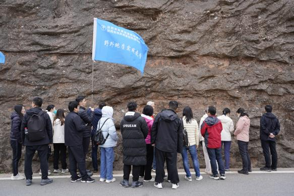 阳春三月,远山含黛。大家在商洛211县道公路旁实地观察和学习了古近系圂囵山组陆相沉积岩地层的岩性及其形成的丹霞地貌构造特征。现场教学过程中,通过观察岩层韵律、颜色和层间构造等特征,了解河流相-河口三角洲相沉积构造。通过触摸亿万年前的沉积岩层,详细观察其因搬运、压实和风化等作用塑造而成的纹理脉络,深切感悟着大自然的鬼斧神工带来的无限魅力。