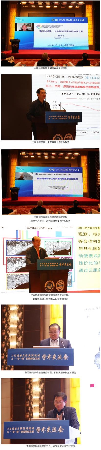 会上,郭华东院士作了题为“数字丝路”的主旨报告,王双明院士作了题为“煤炭主体能源地位与低碳利用”的主旨报告,徐学义研究员作了题为“黄河流域若干生态灾害问题遥感调查监测”的主旨报告,李志忠教授级高工作了题为“地球健康光谱体检——黄河中上游高质量发展思考”的主旨报告,洪增林教授作了题为“黄河流域卫星遥感体系探索与实践”的主旨报告,卫征研究员作了题为“基于空间信息的生态产品价值评价与实现机制分析”的主旨报告。