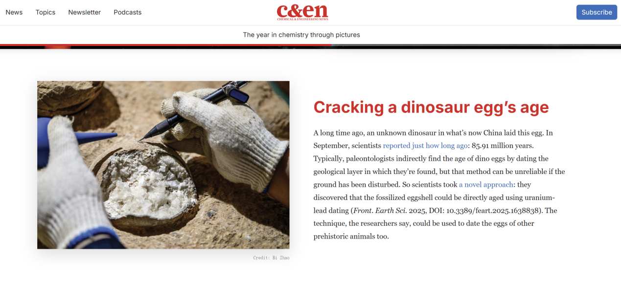 2025年12月2日,美国化学学会旗下权威化学科学新闻网站和杂志《化学与工程新闻》(简称“C&EN”)发布了全球化学科学界的7张大事件照片,并配文报道。省地质调查院发表的“全球首次测定恐龙蛋年龄”研究成果位列其中第五位。