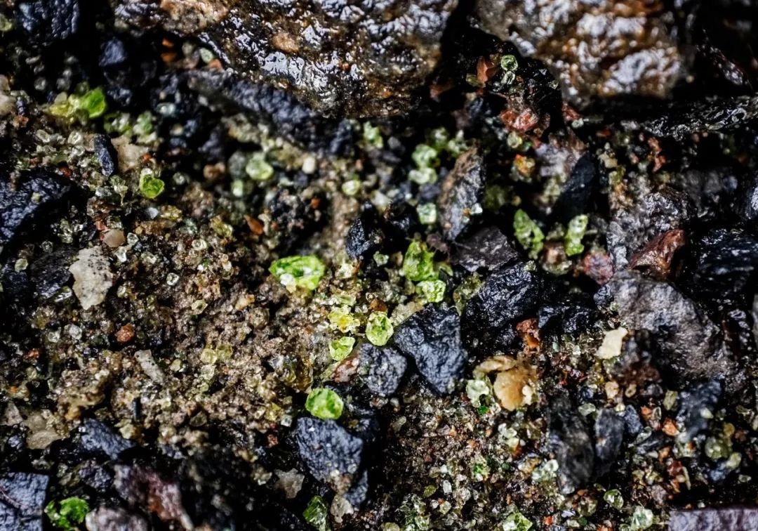 橄榄石常呈橄榄绿色,故名橄榄石。其化学通式为R2Sio4,晶体属斜方晶系的岛状硅酸盐矿物。根据R成分不同,橄榄石可以分成Mg2[Sio4]-Fe2[Sio4](镁橄榄石-铁橄榄石系列)、Mn2[Sio4]-Fe2[Sio4](锰橄榄石-铁橄榄石系列)(Ca,Mg)[Sio4]-(Ca,Fe)[Sio4](钙镁橄榄石-钙铁橄榄石)系列,其中以镁-铁橄榄石系列最为常见。