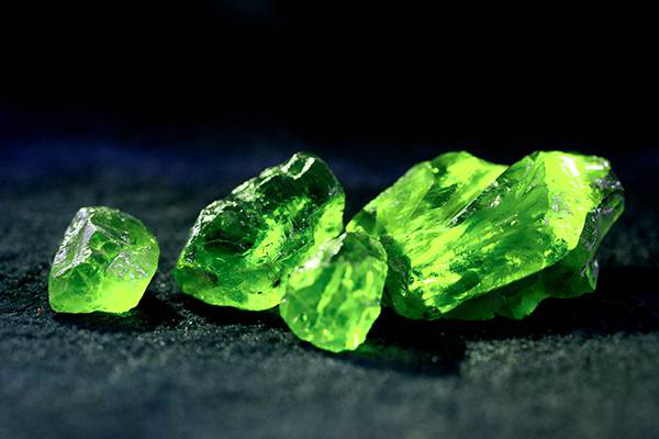 橄榄石多为橄榄绿、黄绿、金黄绿或祖母绿色。纯镁橄榄石呈无色至黄色,富铁则颜色加深。纯铁橄榄石呈绿黄色,氧化时则变褐色或棕色。橄榄石总体而言油脂光泽,透明,具贝壳状断口,韧性较差,极易出现裂纹。大多数橄榄石形成于地球深处,是组成上地幔的主要矿物,也是陨石和月岩的主要矿物成分。它作为主要造岩矿物常见于基性和超基性火成岩中,透明而色泽鲜艳,无瑕疵的橄榄石晶体可作为宝石。