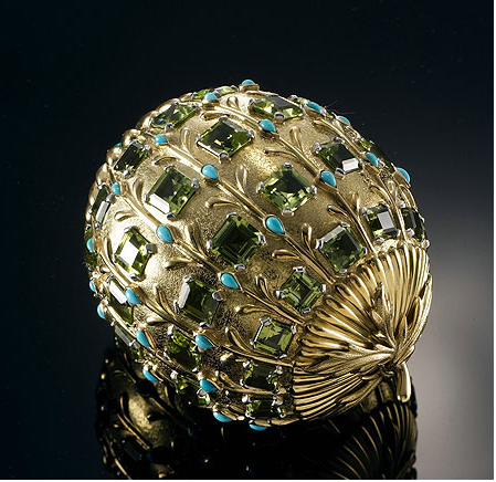 许多人认为橄榄石只是近代的新兴宝石,其实它被发现已有上千年历史。早在公元前2000年,古埃及就已经开始利用橄榄石制作首饰。Tiffany公司上世纪五六十年代曾生产出镶有橄榄石的华美化妆盒,椭球形的錾花金胎上镶嵌着翠绿色的橄榄石和淡蓝色的绿松石,散发出高贵的光芒。欧洲皇室对橄榄石也十分青睐,最著名的是奥地利女大公伊莎贝拉的王冠,镶嵌着五颗巨大橄榄石。